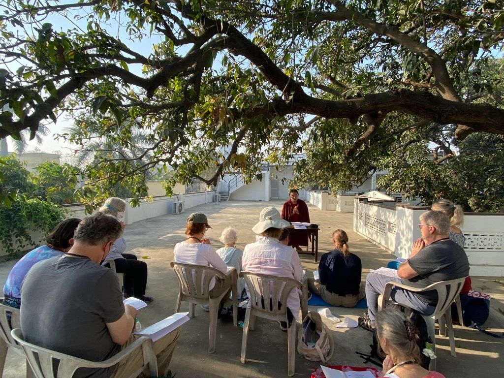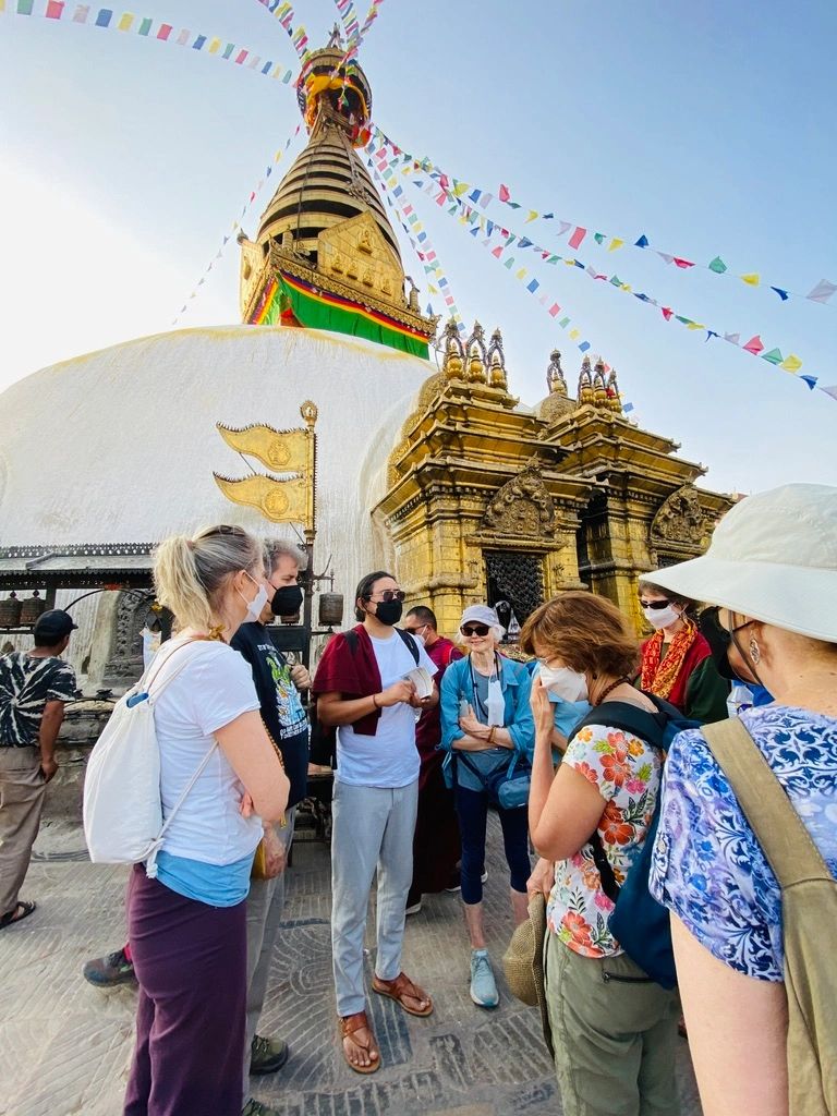 Sacred Journey pilgrims receive a teaching at Swayambunath Temple in Nepal