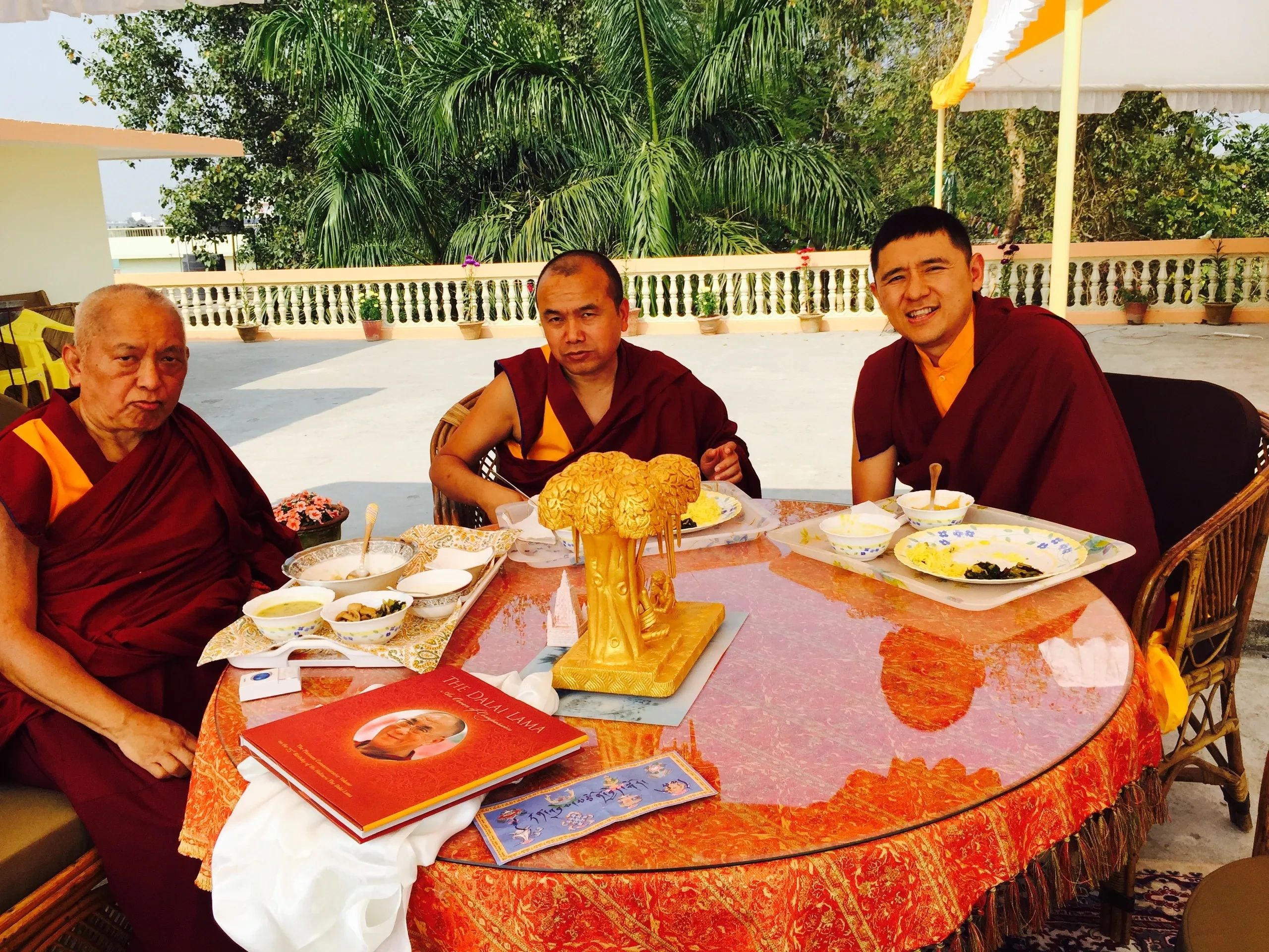 Jigme Rinpoche lunching with Kyabje Lama Zopa Rinpoche and Geshe Dorje Damdul at Root Institute, Bodhgaya, India